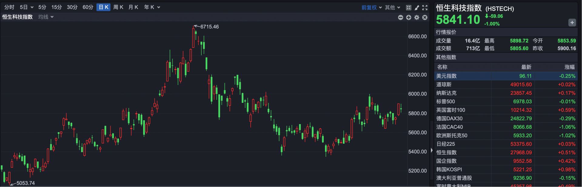 恒生科技指数报收5841.10点,下跌59.06点,跌幅1%。