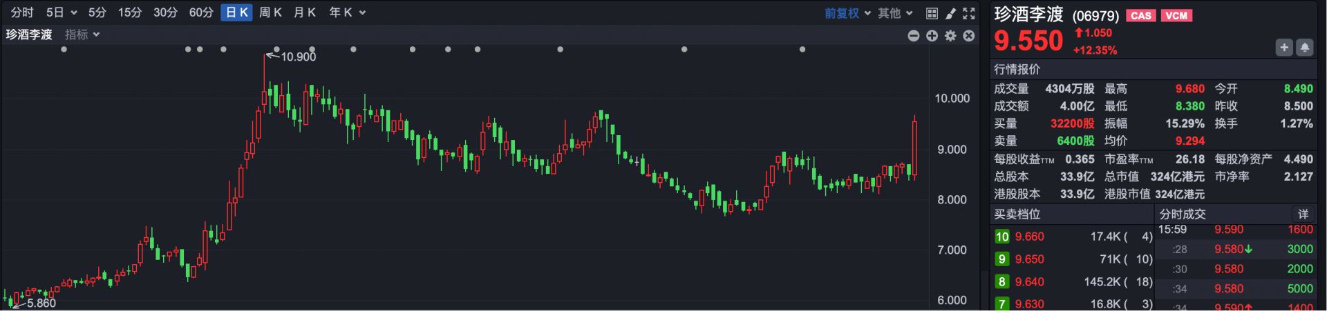 此外,受A股白酒股大面积涨停刺激,港股白酒股珍酒李渡(HK06979)涨超12%。