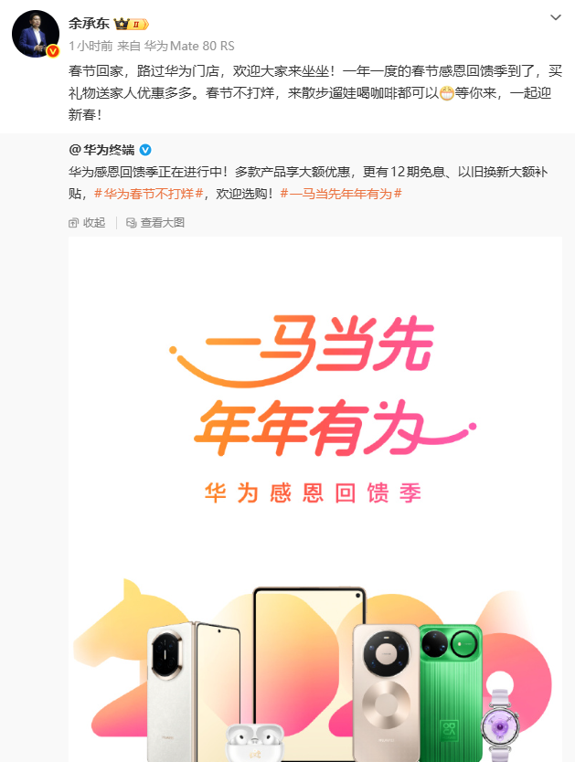 为保障春节假期服务连续性,华为同步宣布,在2026年2月15日至2月23日(农历春节期间),全国超过25000家华为零售店及1300家华为服务店将照常营业,确保节日期间销售、咨询服务与售后支持不打烊。