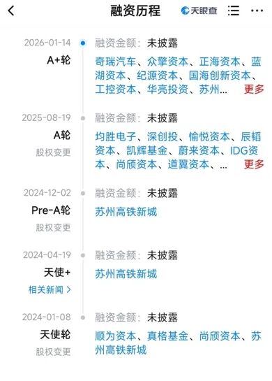 2026年1月,公司完成A+轮融资,投资方包括奇瑞汽车、众擎资本、正海资本、蓝湖资本、纪源资本、国海创新资本、工控资本、华亮投资。
