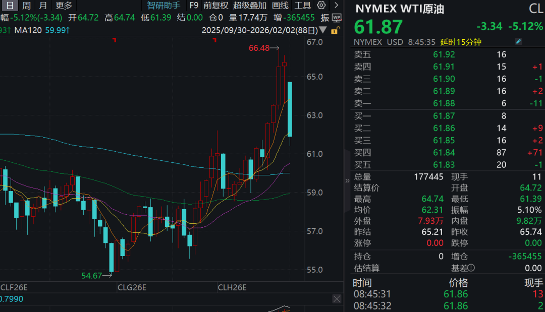 本周一(2月2日),国际油价大幅下跌,布伦特原油期货一度暴跌超5%并跌破每桶66美元;WTI原油一度大跌近6%,价格最低下调至每桶61美元附近。