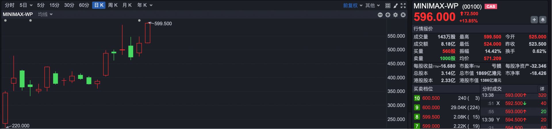 1月9日,MINIMAX在港交所上市交易,发行价为165港元,上市首日报收于345港元,涨幅达109%。而截至今日盘中,MINIMAX最高报599.5港元,较发行价上涨263%。