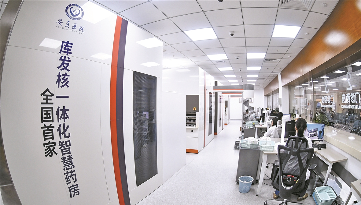 北京安贞医院作为北京市政府指定的首家“机器人+医疗”应用示范单位,现已有25款医疗机器人在临床试用,覆盖了门诊、药房、病房、手术室、导管室等多个区域。机器人“员工”作为医生的智慧助手,正成为北京安贞医院智慧化转型升级的力量。图为北京安贞医院通州院区库发核一体化智慧药房。 新华社记者 李欣/摄