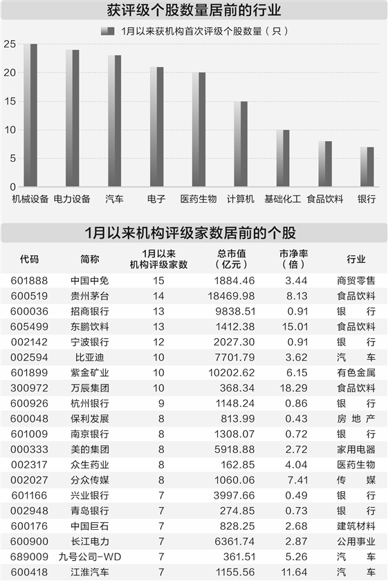 从个股来看,1月以来共有40股获至少5家机构评级,其中中国中免、贵州茅台获机构评级家数居前,分别有15家、14家,招商银行、东鹏饮料获机构评级家数均为13家。