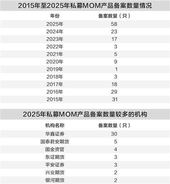 根据证券时报记者统计,2025年,新增备案的私募MOM产品数量达到58只,创下历史新高,是2024年23只的2倍有余。往上追溯,2020年至2023年,这一数据分别为9只、5只、3只、17只,显示之前几年MOM产品的备案明显清淡。