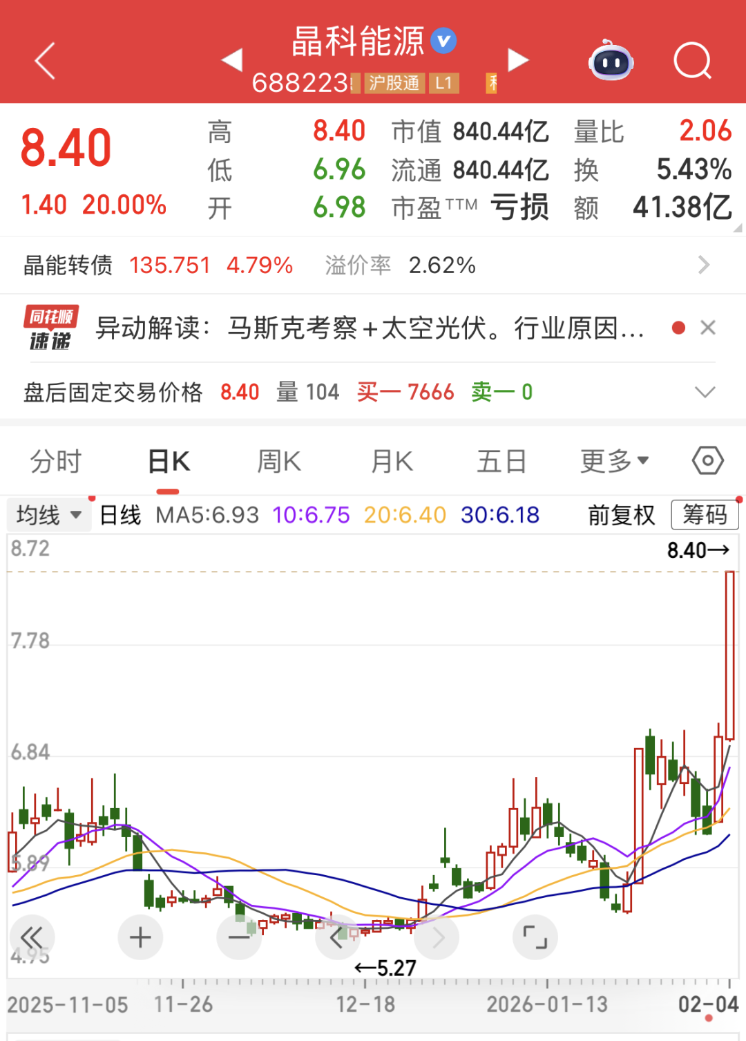 2月4日晚间,晶科能源发布股票交易异常波动公告,公司关注到近期资本市场对“太空光伏”等概念关注度较高,相关板块二级市场表现较为活跃。目前“太空光伏”尚处技术初步探索阶段,产业化进程受技术发展、行业政策、市场环境等多方面因素影响,未来技术应用与产业化落地仍需要一定的时间周期。截至目前,公司主营业务产品仍聚焦于地面光伏领域,公司未有涉及“太空光伏”的订单收入,未对公司经营业绩造成影响,请投资者注意理性判断。