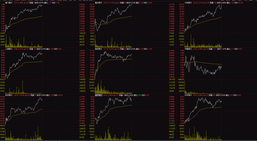 临近上午收盘,银行板块出现一波拉升,使得板块盘中涨幅超过1%。厦门银行、重庆银行、杭州银行等盘中涨幅一度明显扩大。