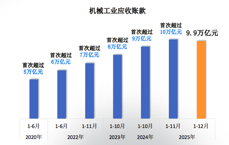 数据显示,2025年末,机械工业应收账款总额达9.9万亿元,同比增长7.1%,占全国工业应收账款总额的36.0%,同比提高0.8个百分点;应收账款占营业收入的29.7%、占流动资产的35.7%,均创历史新高,较同期全国工业高10和7个百分点。应收账款平均回收期为100.1天,同比延长2.4天,较全国工业平均水平长32.2天。分行业看,重型矿山、工程机械行业的账款平均回收期超过150天,压力尤为突出。