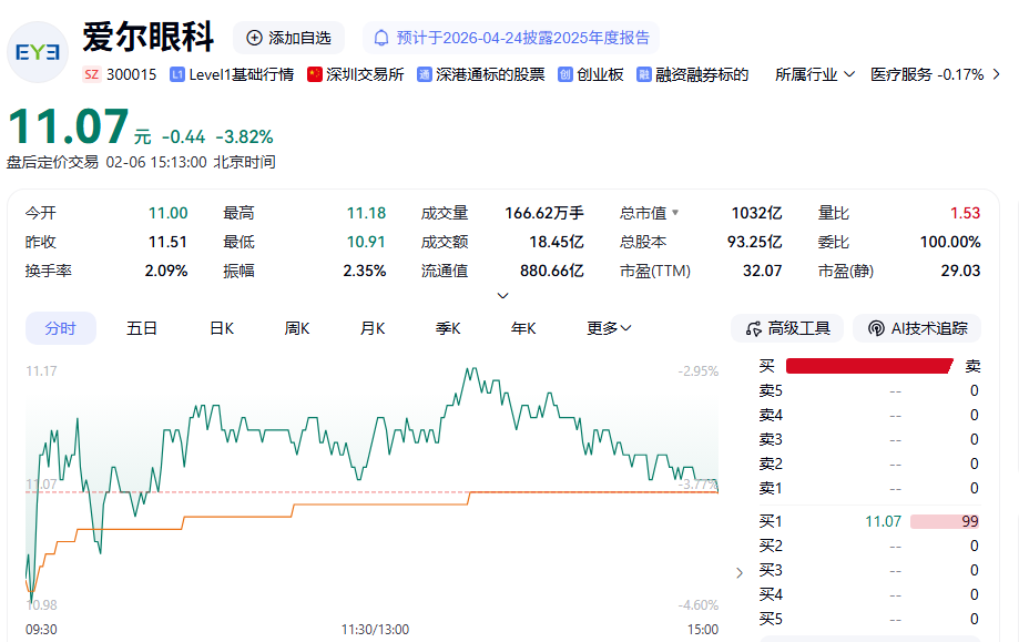 二级市场上,截至2月6日收盘,爱尔眼科跌3.82%,股价报11.07元/股,总市值为1032亿元。