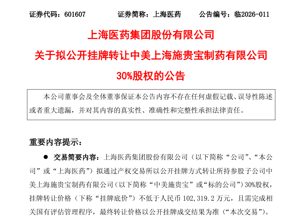 2月4日晚,上海医药公告披露,公司拟通过产权交易所以公开挂牌方式转让所持参股子公司中美上海施贵宝制药有限公司(以下简称“中美施贵宝”)30%股权,挂牌转让价格不低于人民币10.23亿元。