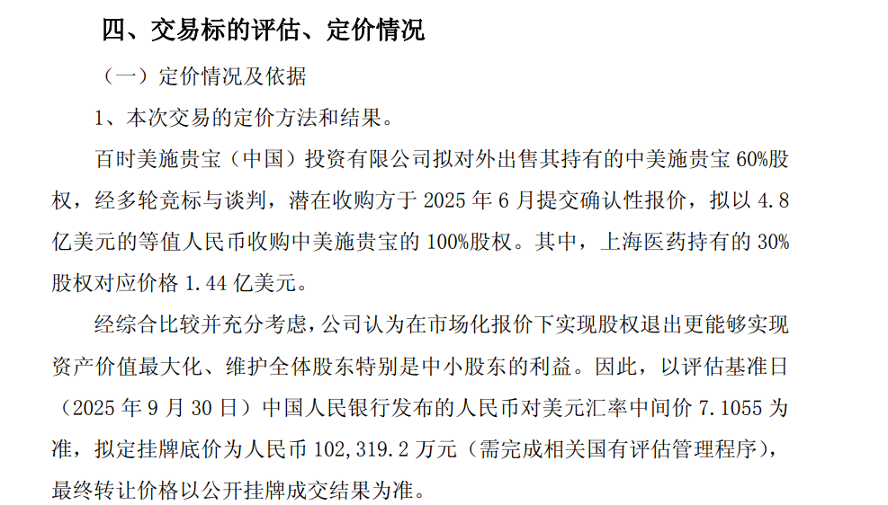 根据上海医药公告,百时美施贵宝(中国)投资有限公司拟对外出售其持有的中美施贵宝60%股权,经多轮竞标与谈判,潜在收购方于2025年6月提交确认性报价,拟以4.8亿美元的等值人民币收购中美施贵宝的100%股权。其中,上海医药持有的30%股权对应价格1.44亿美元。根据2025年9月30日中国人民银行发布的人民币对美元汇率中间价7.1055为准,拟定挂牌底价为人民币10.23亿元。