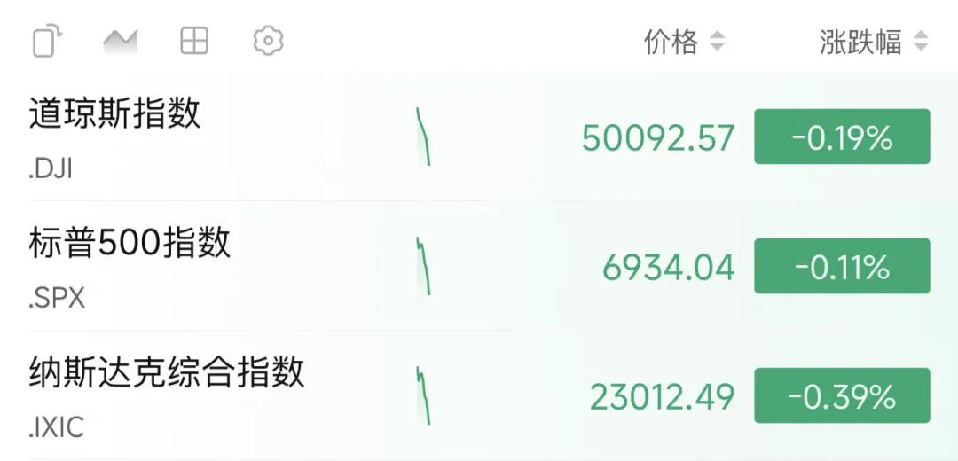 盘面上,美股三大股指集体高开,随后一路向下并转跌。截至发稿,道指跌0.19%,标普500指数跌0.11%,纳指跌0.39%。