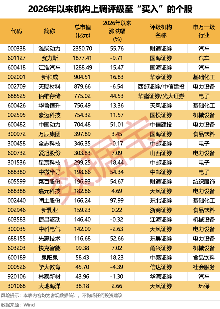从评级调整情况来看,26股评级获得机构上调:汽车板块的潍柴动力、赛力斯、江淮汽车、林泰新材,食品饮料板块的万辰集团、新乳业、泉阳泉,电子板块的佰维存储、全志科技、星宸科技、中微半导等均上榜。