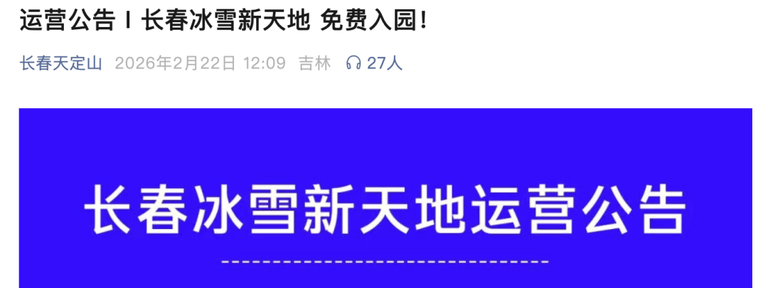 除免费入园外,公告还称,凡已购买并核销了2026年2月20日、21日长春冰雪新天地门票的游客,可凭原购票记录,可在2025-2026或在2026-2027冰雪季运营期间免费入园一次。对于本雪季已购买长春冰雪新天地门票但尚未核销使用的游客可通过原购票渠道申请全额退款。