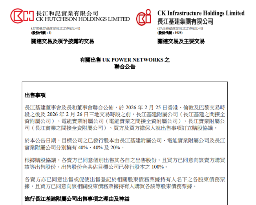 2月26日早间,李嘉诚旗下长和系三家公司长江基建集团、电能实业及长实集团在港交所发布公告,已与法国公用事业企业Engie旗下子公司Engie UK 2026 Limited订立协议,出售三方合共持有的英国电网公司UK Power Networks Holdings Limited 100%股权,套现逾1100亿港元。