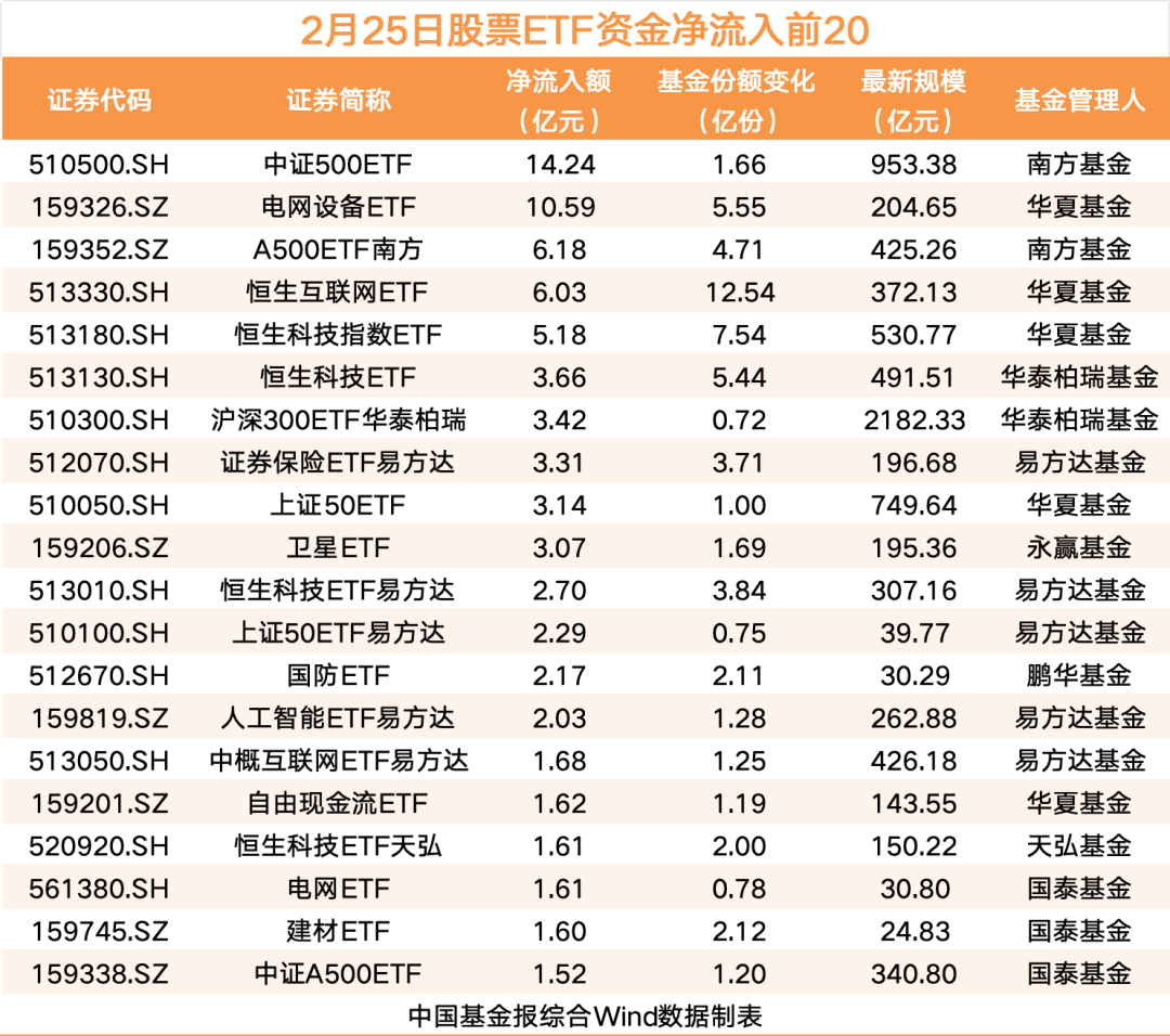 具体来看,2月25日共有32只ETF资金净流入超1亿元。其中,中证500ETF以14.24亿元的资金净流入排在首位;电网设备ETF、A500ETF南方分列第二、第三位,资金净流入分别为10.59亿元、6.18亿元。