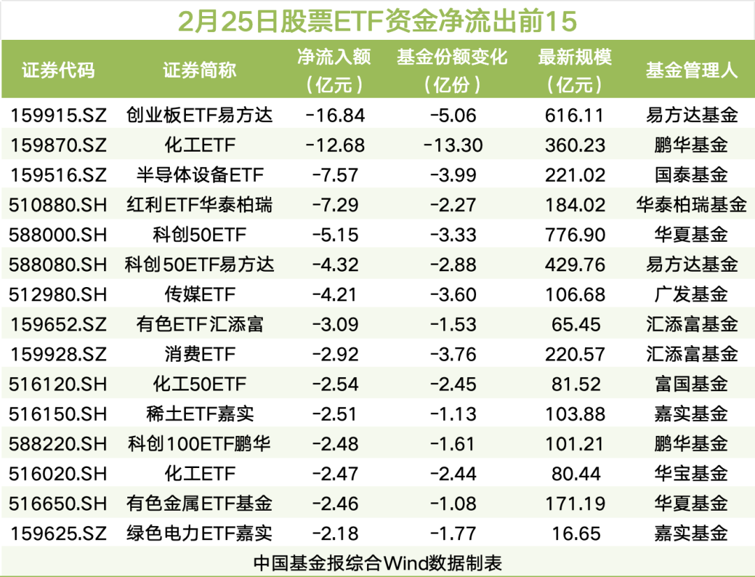 2月25日,A股三大指数集体收涨。股票ETF市场上,资金选择“落袋为安”,当日净流出约14亿元。