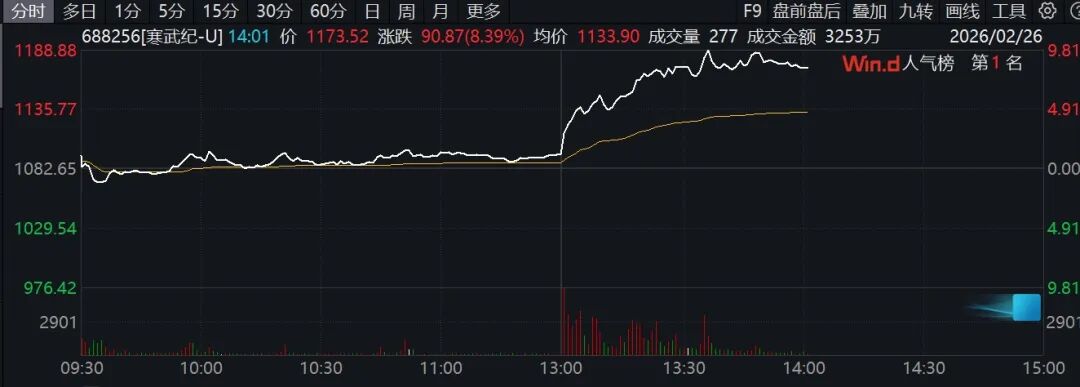 午后算力芯片概念拉升,寒武纪一度涨近10%,云天励飞、海光信息、东芯股份、芯原股份、摩尔线程等跟涨。
