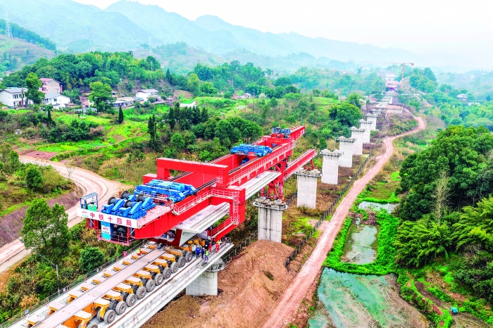 2月26日,在重庆市合川区清平镇的西渝高铁建设工地,架梁机在进行架梁作业。新华社图