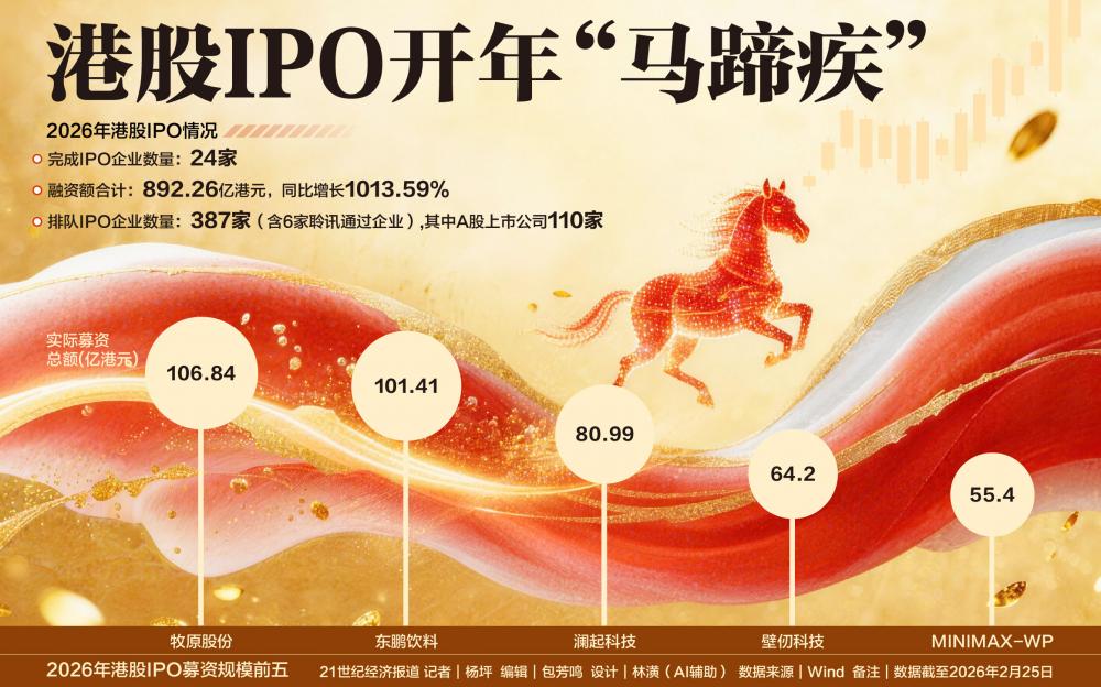 今年上市的24只新股中,有两家企业募资规模超过百亿,二者均为来自A股市场的消费企业,其中牧原股份以106.84亿港元的募资规模,创下2026年迄今全球农牧企业最大规模IPO纪录。紧随其后的东鹏饮料,募资规模为101.41亿港元,为2020年迄今亚洲消费饮料行业最大规模发行。