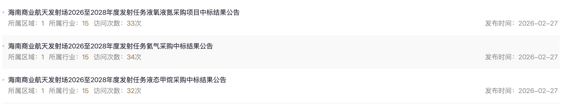 人民财讯2月27日电,今日(27日),海南商业航天发射场火箭发射使用燃料采购中标结果正式出炉,九丰特种气体成为最大赢家,在液氧液氮、液态甲烷、氦气领域合计中标约1.45亿元。另外,广钢气体在氦气采购项目中有所斩获。具体而言,根据《海南商业航天发射场2026至2028年度发射任务液氧液氮采购项目中标结果公告》,海南九丰特种气体有限公司中标标段1采购项目,中标价9265.15万元;海南锋利气体有限公司中标标段2采购项目,中标价2498.46万元。根据《海南商业航天发射场2026至2028年度发射任务氦气采购中标结果公告》,广钢气体(广州)有限公司中标标段1项目,中标金额3267万元;广东九丰特种气体有限公司中标标段2采购项目,中标金额848万元。根据《海南商业航天发射场2026至2028年度发射任务液态甲烷采购中标结果公告》,海南九丰特种气体有限公司为中标人,中标金额4429.75万元。