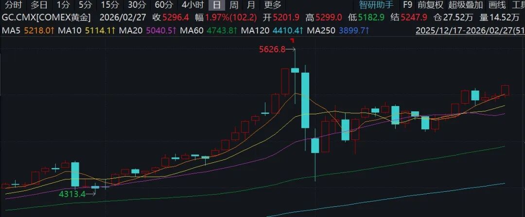 此前于2月27日,国际黄金、白银、油价集体大涨,COMEX黄金期货收涨1.64%,COMEX白银期货涨7.67%。