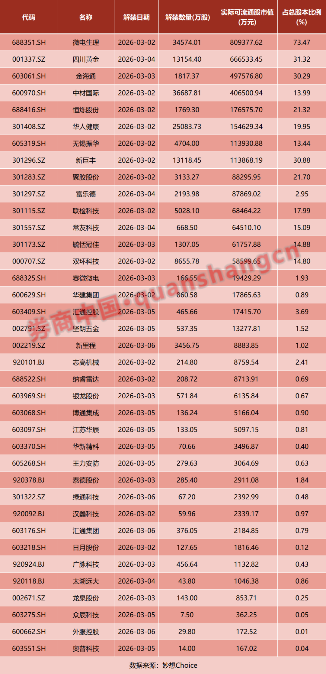从解禁市值来看,解禁市值居前三位的是:微电生理(80.94亿元)、四川黄金(66.65亿元)、金海通(49.76亿元)。