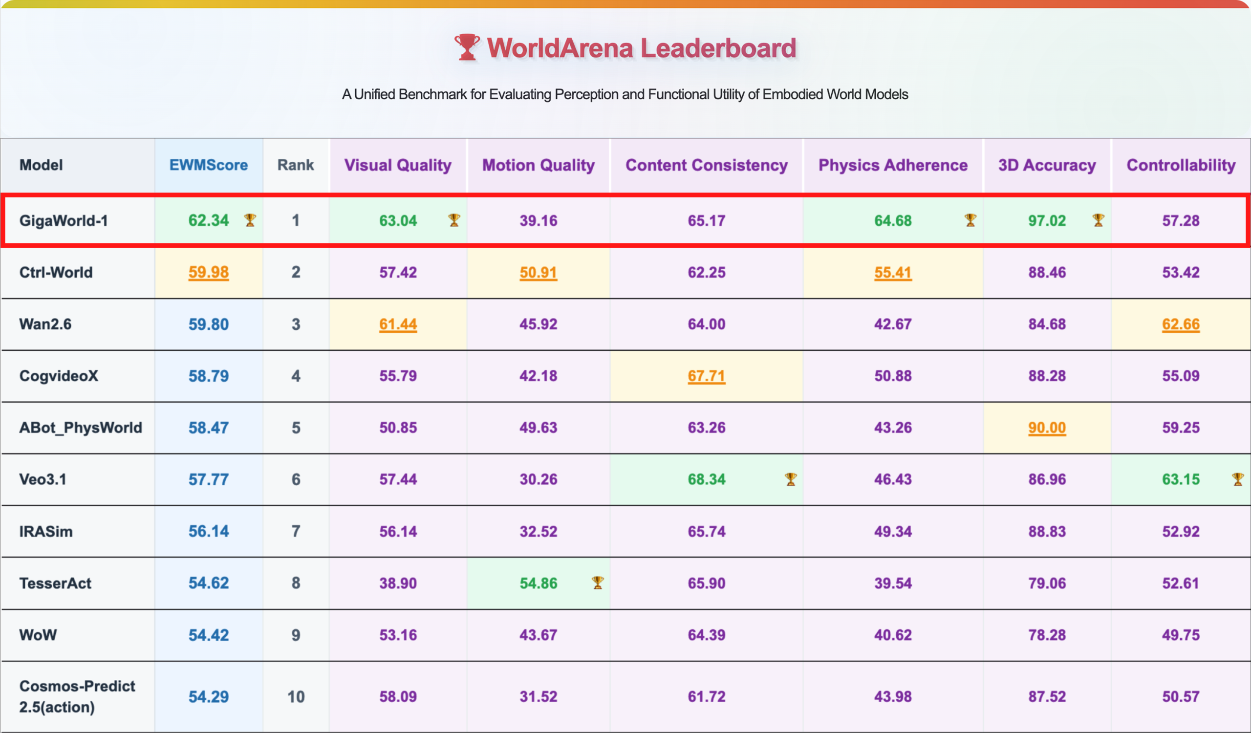 极佳视界世界模型GigaWorld-1再获全球第一