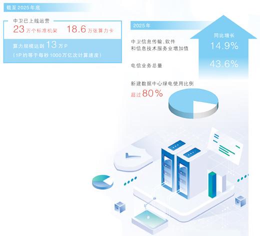 中卫是宁夏算力产业的核心区。2023年以来,随着人工智能快速发展和“东数西算”工程深入推进,企业投资需求激增,中卫算力产业再次驶入“快车道”。中卫市数据局副局长任涛说,截至2025年底,中卫已上线运营23万个标准机架、18.6万张算力卡,算力规模达到13万P(1P约等于每秒1000万亿次计算速度)。