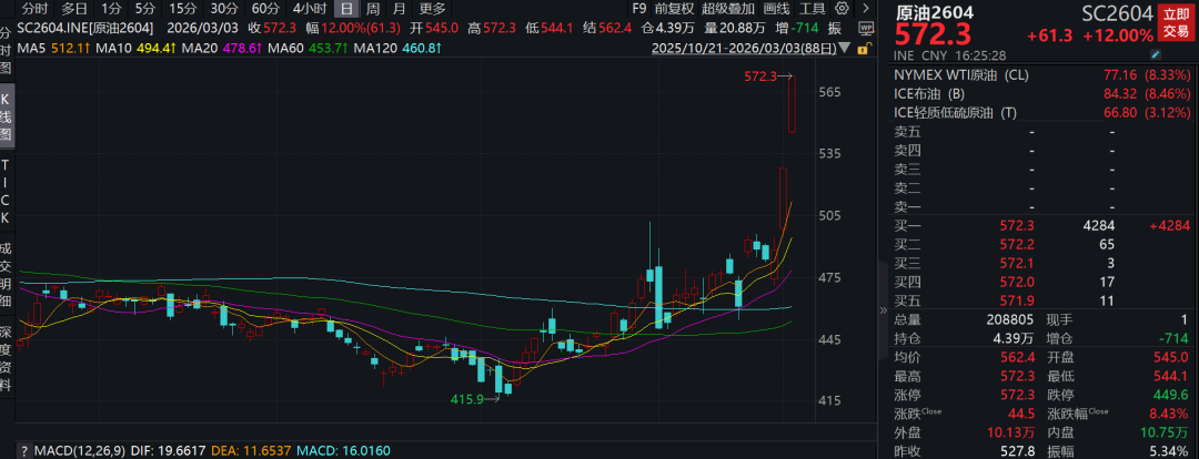 原油是本轮能化市场大涨的旗帜,受到的供应冲击也最为直接。周二,原油期货主力SC2604合约收盘连续第二日涨停,收报572.3元/桶,涨幅为12%。