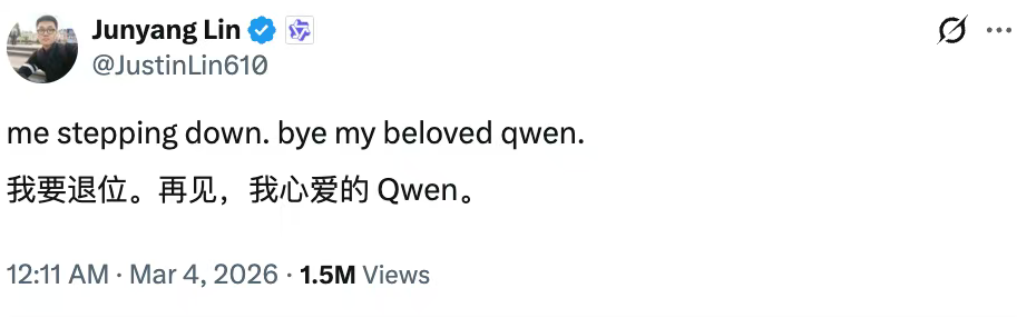 不过,林俊旸没有直接表明自己将从阿里巴巴离职,目前其去向未明。
