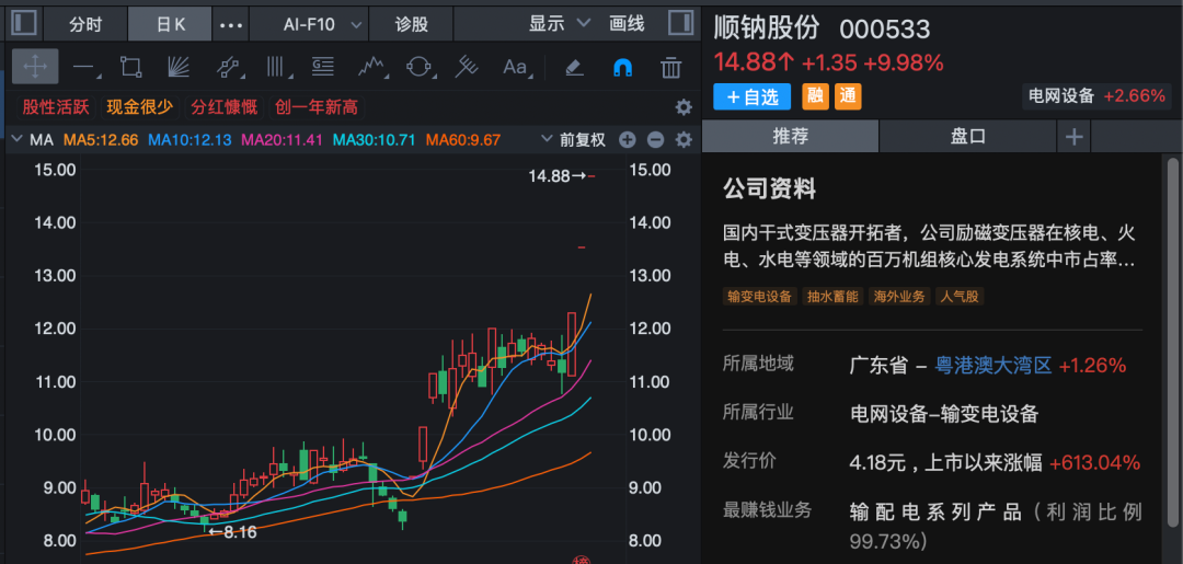 新能源产业链继续保持强势,风电板块指数连续第3日上涨,并创历史新高。顺钠股份一字涨停,连续第3日封板;奥特迅高开后秒速涨停,金开新能、汉缆股份等逾10股涨停或涨超10%。