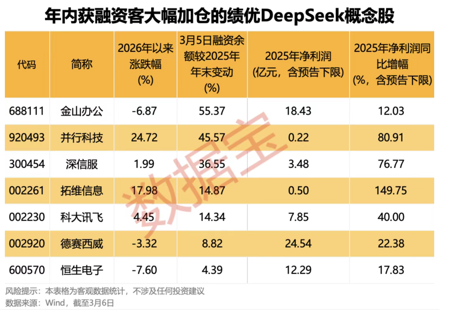 从融资资金来看,上述45只DeepSeek概念股3月5日融资余额合计622.75亿元,较2025年年末增加近4%;半数融资融券标的获加仓,加仓幅度居前的有金山办公、每日互动、拓尔思,3月5日融资余额较2025年年末增幅均超过50%。