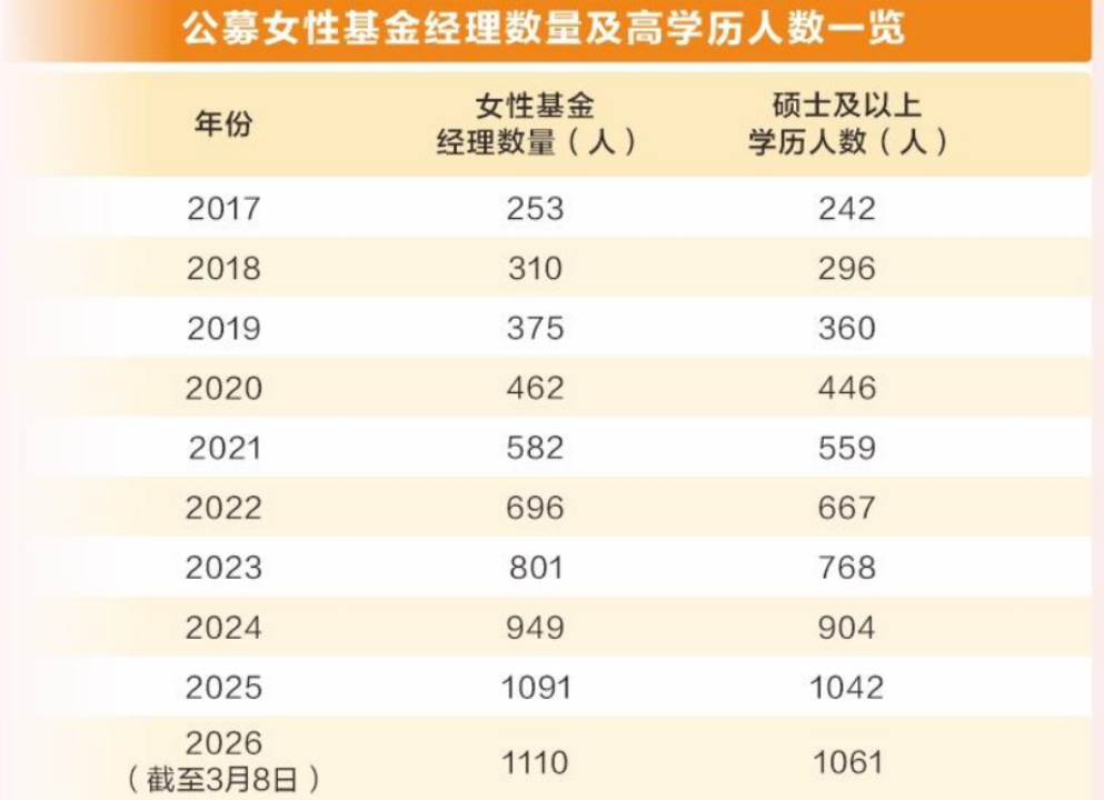 据Wind数据统计,截至2026年3月8日,国内公募基金公司的女性基金经理数量为1110位,占基金经理总人数的26.73%,较2023年末提升0.57个百分点。学历层面,女性基金经理呈现“高知化”特征,95.59%拥有硕士及以上学位,其中48人为博士,深厚的学术背景为投研能力奠定坚实基础。经验积淀同样深厚,135位女性基金经理任职超十年,景顺长城基金毛从容从业逾20年,成为行业任职最久的女性基金经理;华夏基金郑煜、大成基金王立等资深人士也已坚守岗位近20年。