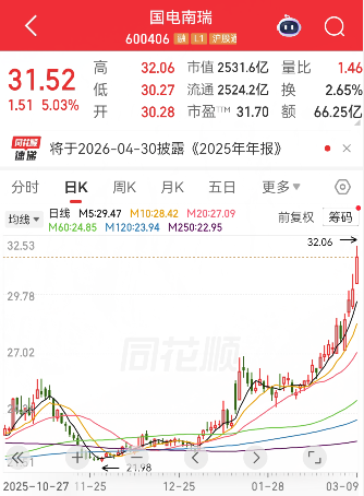 人民财讯3月9日电,3月9日,国电南瑞股价大涨5.03%,最新收盘价31.52元/股,创下历史新高,公司最新A股市值达到2531.6亿元。