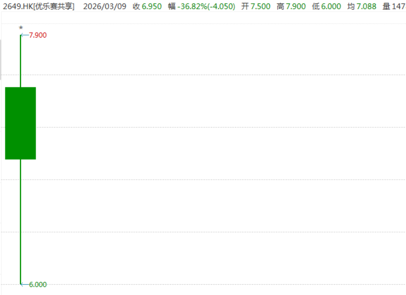 今日优乐赛共享在港股上市,早盘低开31.82%,随后跌幅不断扩大,盘中最大跌幅超45%,最低跌至6港元/股,截至发稿时的跌幅为36.82 %,报6.95港元。