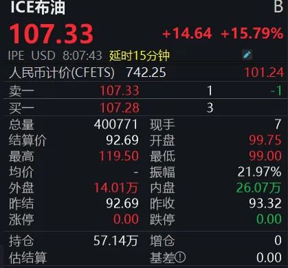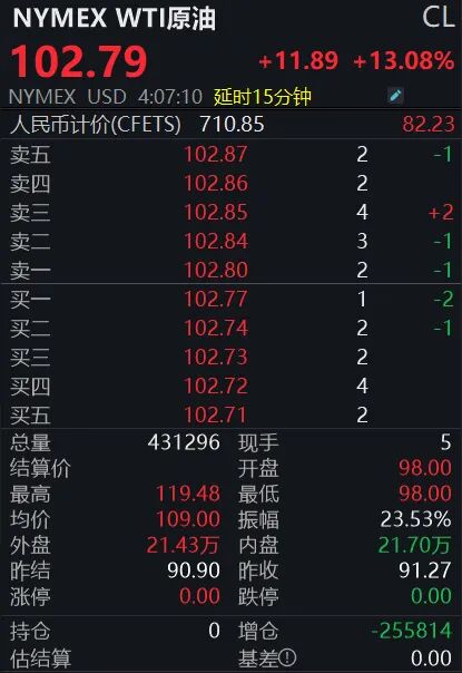 具体来看,国际原油期货市场呈现爆发式上涨态势。WTI原油期货盘中一度涨超30%,最高触及119.48美元/桶;布伦特原油期货一度涨超28%,最高报119.5美元/桶。截至记者发稿,WTI原油大涨13.08%,报102.79美元/桶;布伦特原油期货大涨15.79%,报107.33美元/桶。