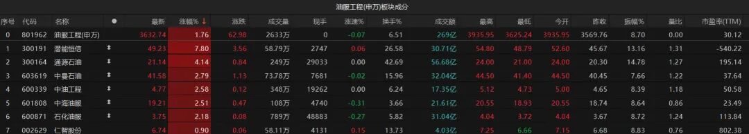 油价暴涨的同时,油气相关板块同步联动走强。A股市场上,油气股开盘逆市飙升,中国海油、中曼石油、中油工程等龙头个股开盘一度封死涨停,随后随着油价回落,涨幅逐步收窄。截至当日收盘,油服工程板块整体收涨1.76%,潜能恒信涨超7%,通源石油、中曼石油、中油工程、中海油服等多只个股跟随上涨。