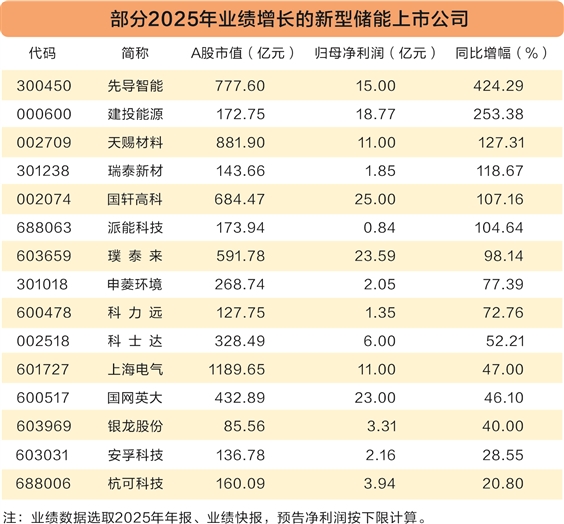 根据目前披露的2025年年报、业绩快报、预告净利润下限(若无下限则取公告数值)统计,2025年净利润同比增长20%以上(含扭亏为盈)的新型储能概念股有21只,其中6股业绩扭亏为盈,分别为恩捷股份、杉杉股份、智光电气、鹏辉能源、固德威、信德新材。
