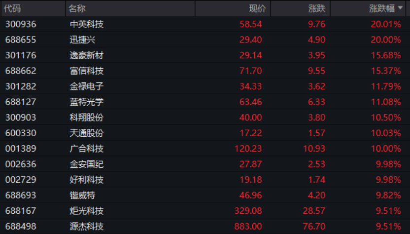 电子板块涨幅居前,板块涨幅亦超过2%,中英科技、迅捷兴等“20cm”涨停,天通股份、广合科技、金安国纪、好利科技等涨停。