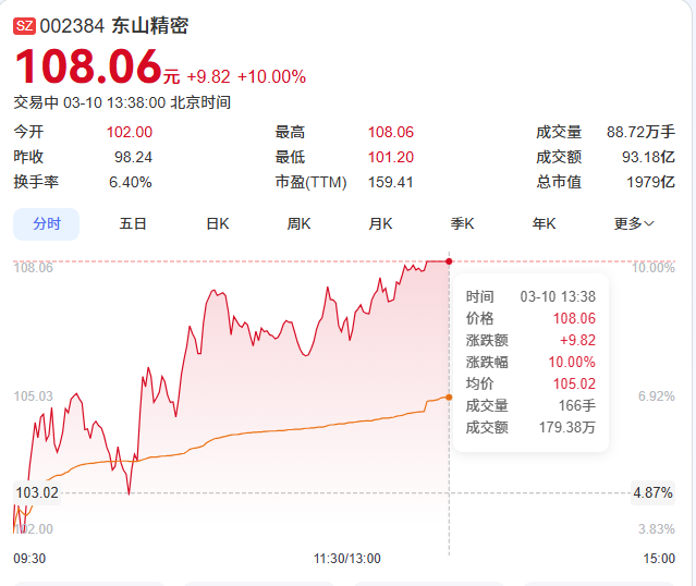 人民财讯3月10日电,3月10日,东山精密(002384)股价大幅上涨,午后该股触及涨停板,股价达到108.06元/股,创下历史新高,同时也是其历史首次达到百元以上,最新A股市值逼近2000亿元。