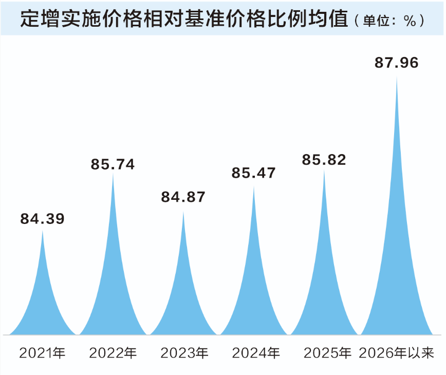 从A股整体来看,2025年定增发行价格相对基准价格平均值接近86%,创2021年以来新高;2026年以来提升至接近88%。