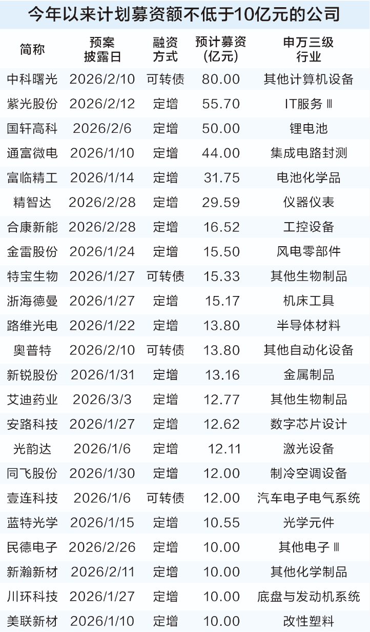 中科曙光、紫光股份、国轩高科均计划募资不低于50亿元,其中中科曙光募资方式为可转债,后2家公司为定增,这3家公司分别是人工智能、半导体、储能产业的代表。