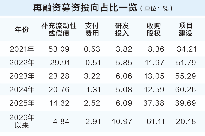 2025年用于收购股权的再融资规模占比突破37%,接近上年水平的三倍。“十四五”时期,再融资用于项目建设与产能扩张的占比常年保持在30%以上,2025年接近40%。