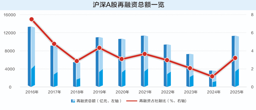 随着政策从总量管控转向结构优化,2025年再融资市场活跃度明显回升,沪深A股再融资总额达到1.13万亿元,创2022年以来新高。对比社融数据,2025年沪深A股再融资占社融比例为3.19%,同样创下2022年以来新高。