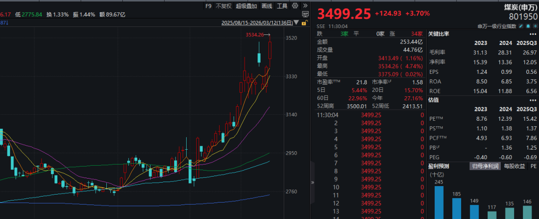 盘面上,煤炭板块大涨,板块涨幅超过3%,成为上午A股市场最大板块亮点。郑州煤电、兖矿能源涨停。中煤能源、陕西黑猫、潞安环能等多股涨幅超过5%。