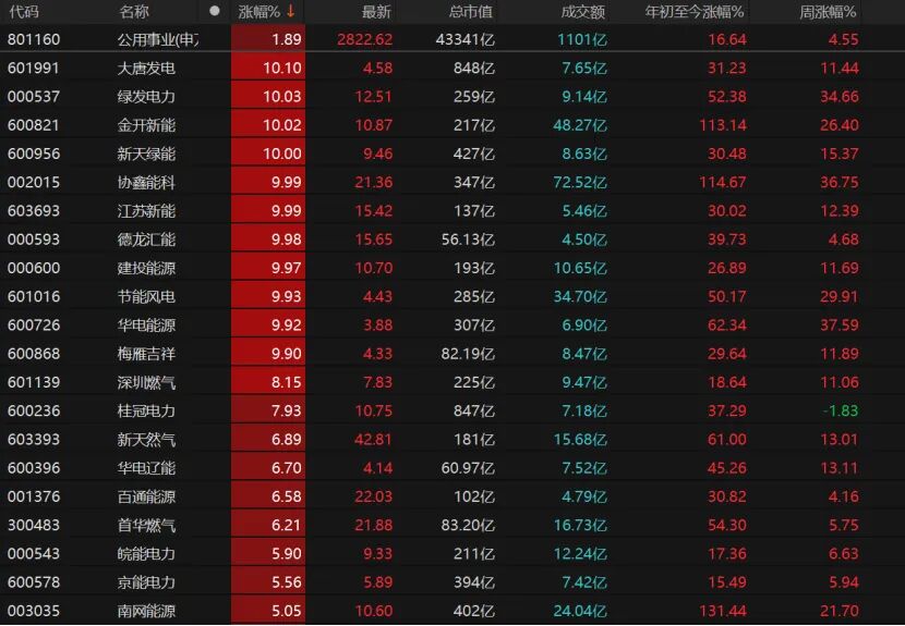 12只公用事业个股涨停,大唐发电、绿发电力、金开新能、新天绿能、协鑫能科、江苏新能、德龙汇能等涨停。