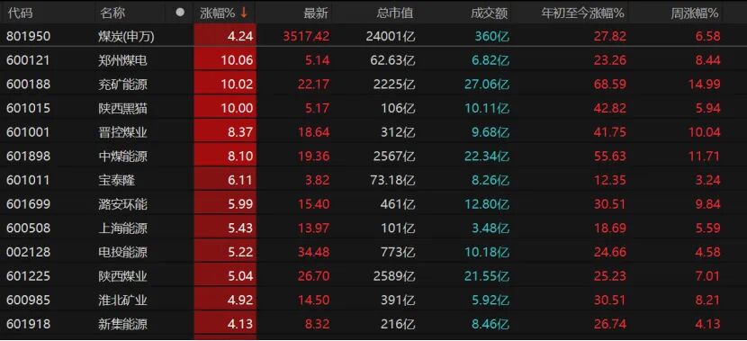郑州煤电、兖矿能源、陕西黑猫涨停,晋控煤业、中煤能源、宝泰隆、潞安环能、上海能源涨幅均超过5%。