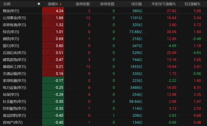 煤炭板块大涨,公用事业、农林牧渔、综合板块表现也不错。