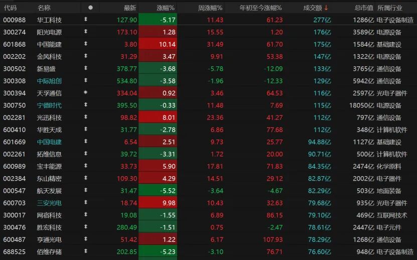 个股方面,亏钱效应明显。全市场3893只个股收跌,跌停股6只;1494只个股收涨,涨停股64只。活跃股中,10只个股日成交额超100亿元,阳光电源继续收红,中国能建涨停,金风科技涨逾3%。但新易盛、中际旭创均跌近4%。